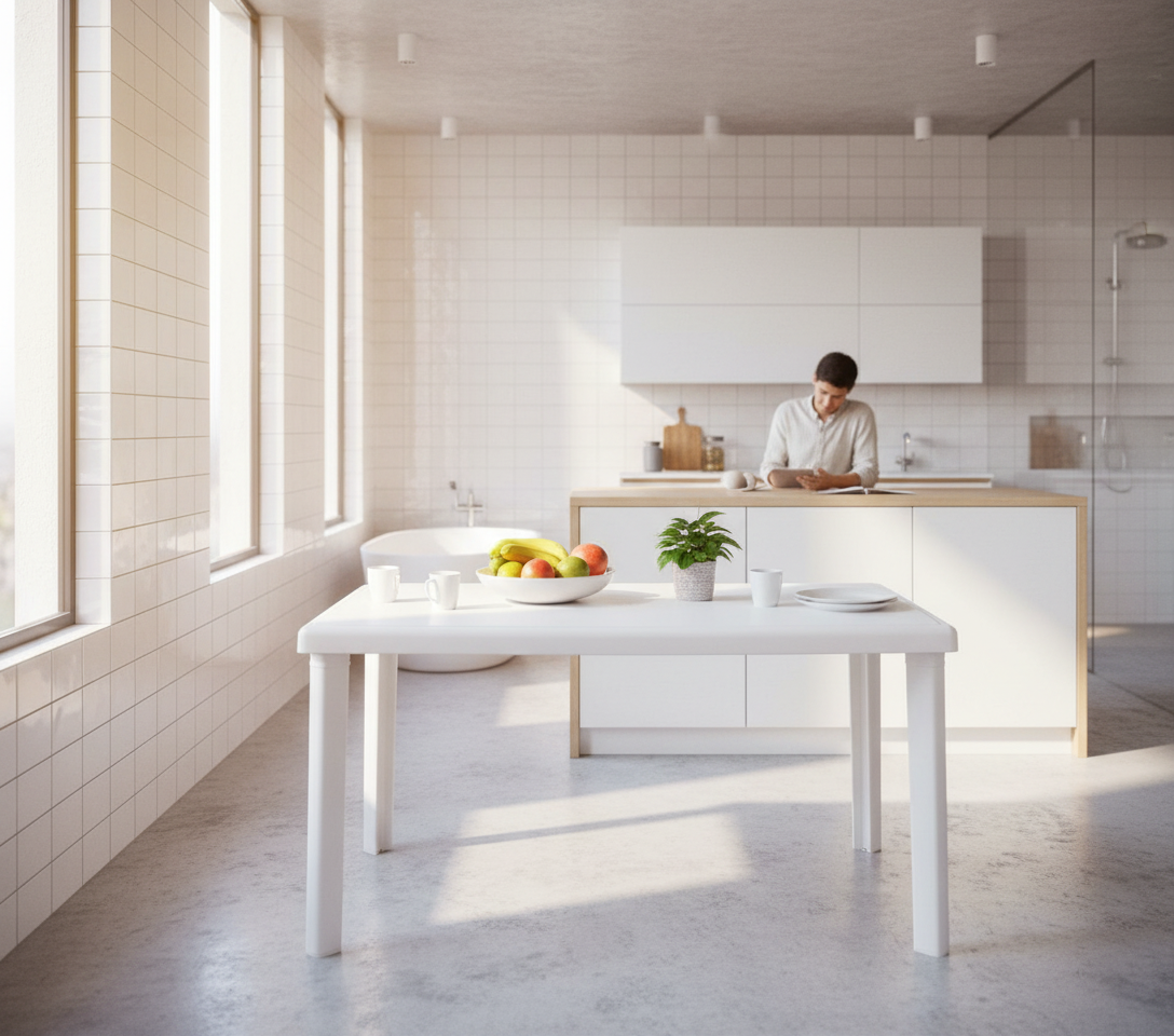 Compramos 5 unidades da Mesa Retangular JSN ME4b para nosso refeitório e estamos muito satisfeitos. A resistência do tampo é notável e a cor branca facilita a percepção de limpeza. A montagem foi simples e os pés plásticos realmente protegem o chão. Recomendo para quem busca durabilidade e praticidade.