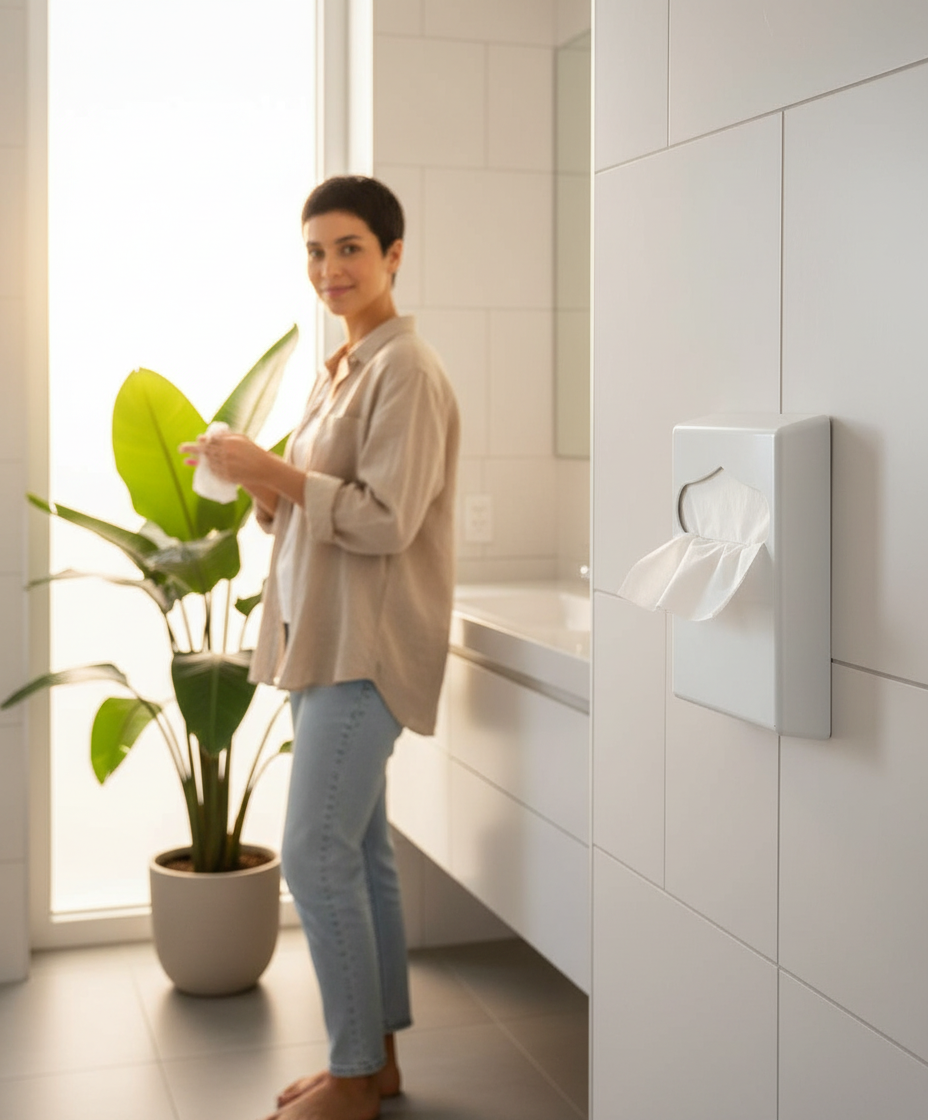 - ✅ Praticidade Recarregável: Facilita a reposição dos protetores de assento, otimizando o tempo da equipe de limpeza e manutenção.
